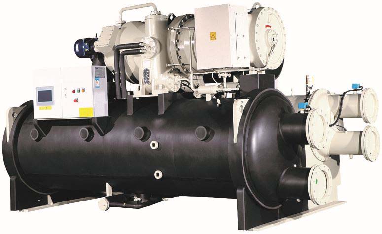 离心式冷水机组,采用高效半封闭两级离心式压缩机,定频或变频控制,水冷变频离心式冷水机组制冷综合能效IPLV达到国标一级能效,高温离心式水源热泵机组最高出水温度可达72℃。